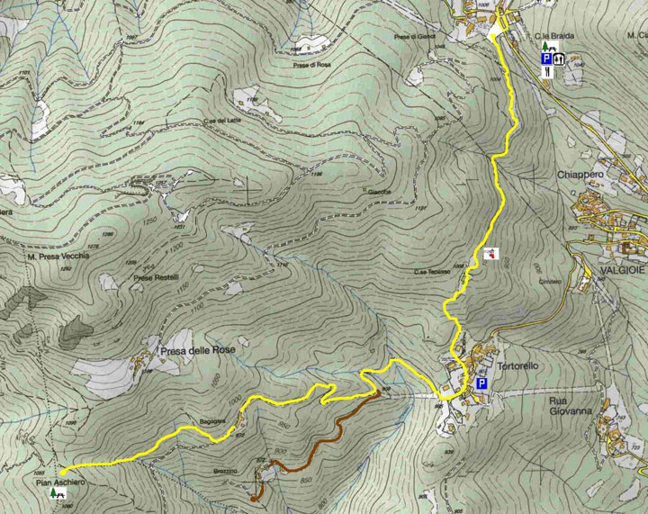 Partenza dal piazzale del Colle Braida; si imbocca la strada sterrata che conduce in borgata "Presa di Stefano" (C.se Tepasso) un assolato borgo di baite da dove possiamo ammirare uno spledido panorama di Valgioie ed il pilone votivo dedicato alla "Madonna del Rocciamelone". Attraversate le baite occorre imboccare il sentiero che scende verso la Borgata Tortorello (indicato sul luogo) e dopo pochi minuti si raggiungono le prime case. Terminata la discesa lungo la strada interna della borgata, occorre imboccare a destra per giungere alla piazza del Tortorello dove sulla sommità si può ammirare il Pilone votivo in ottimo stato di conservazione (dedicato alla Madonna con Bambino). Proseguendo lungo la strada sterrata che scende verso il bosco si attraversa il ruscello Rio Tortorello; la strada riprende in lieve salita fino a giungere al bivio, in corrispondenza della croce in pietra, tra il sentiero giallo che stiamo percorrendo e quello marrone che porta comodamente alla borgata "Ca' Brusin". Proseguendo per la strada di destra tra castagni, quercie e faggi saliamo verso un incantevole borgo "Bagagera" che ci accoglie all'entrata con un originale "forno" ove un tempo veniva cotto il pane per i residenti.
