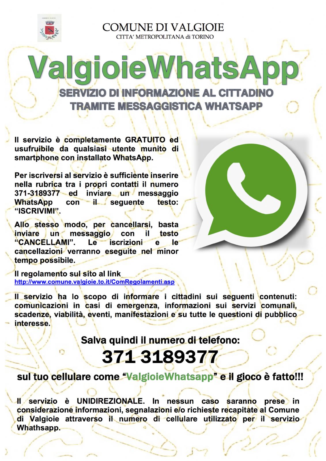 E' stato attivato il nuovo servizio per inviare comunicazioni ai Valgioiesi su telefoni smartphone tramite l'applicazione WhatsApp.Leggere la locandina allegata per i dettagli sulla modalità di attivazione.